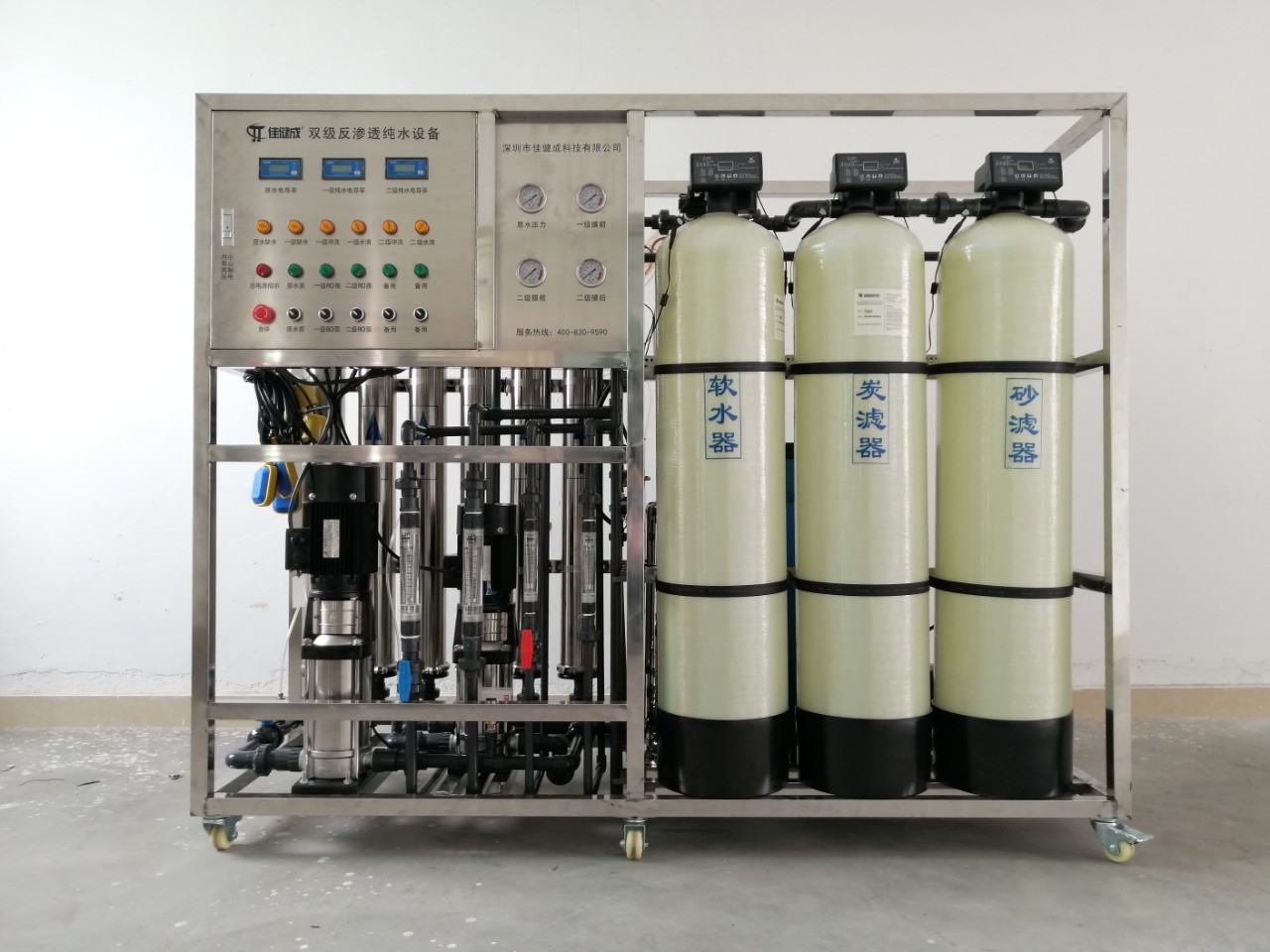 原水箱-增压泵-石英砂过滤器-活性炭过滤器-软水器-一级RO反渗透主机-纯水箱-用水点。