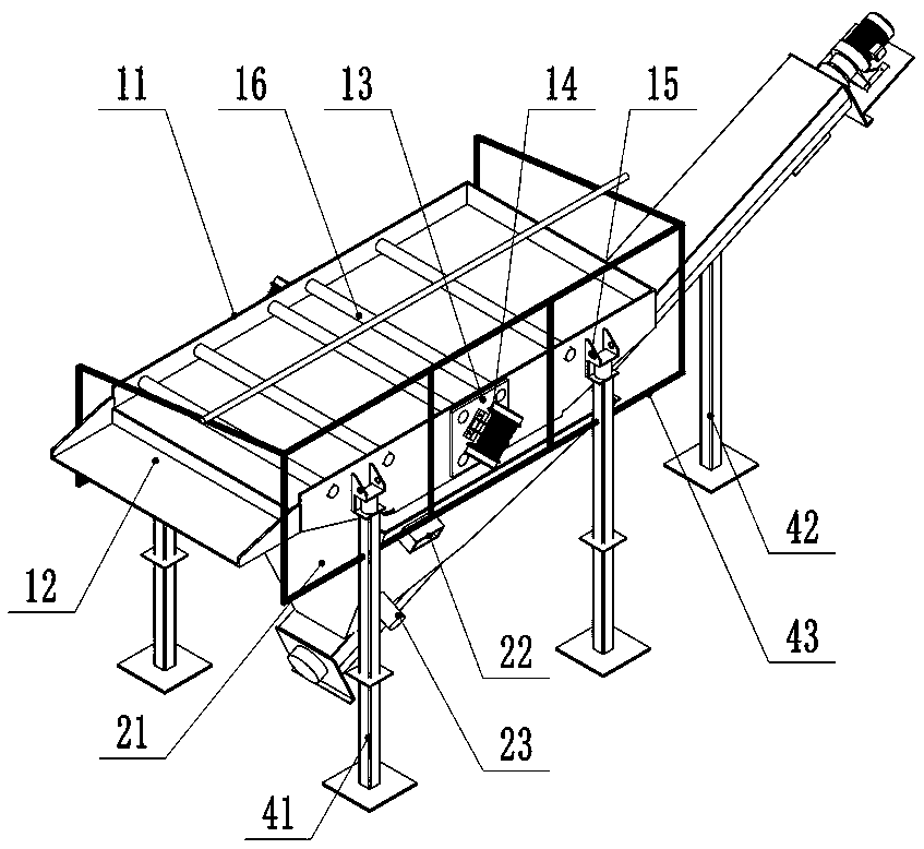 具体地,所述螺旋输送机包括输送管道、减速电机和螺旋叶片运输杆,所述螺旋叶片运输杆固定安装在所述输送管道内,所述螺旋叶片运输杆的主动端、从动端分别设置有主动端轴承座组件、从动端轴承座组件,所述螺旋叶片运输杆的主动端与所述减速电机连接,所述减速电机通过减速电机安装座固定安装在所述输送管道的一端,所述输送管道的中部与所述机架固定安装,所述输送管道靠近所述从动端轴承组件的位置上设置有进料口,所述进料口与所述沉淀槽的底部相连接,所述排砂口布置在输送管道靠近主动端轴承座组件的位置。